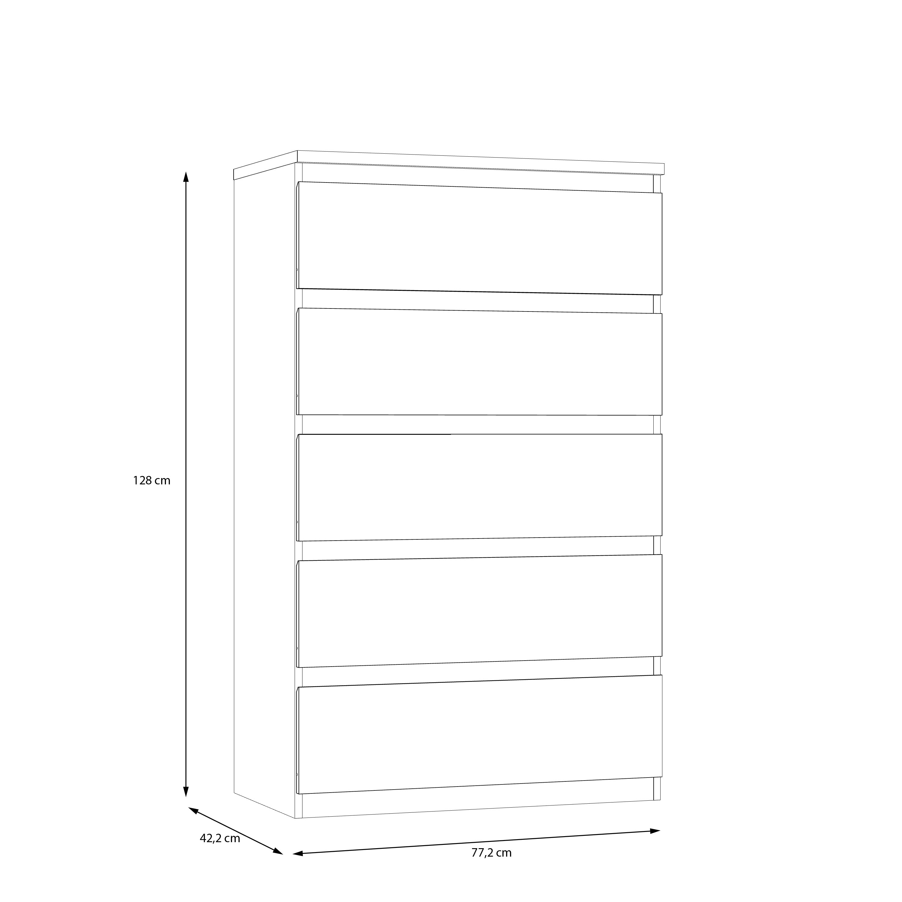 - Dimensions: Measuring Width 77cm, Height 128cm, and Depth 42cm, this wide chest of drawers offers significant storage without taking up excessive floor space in your bedroom.