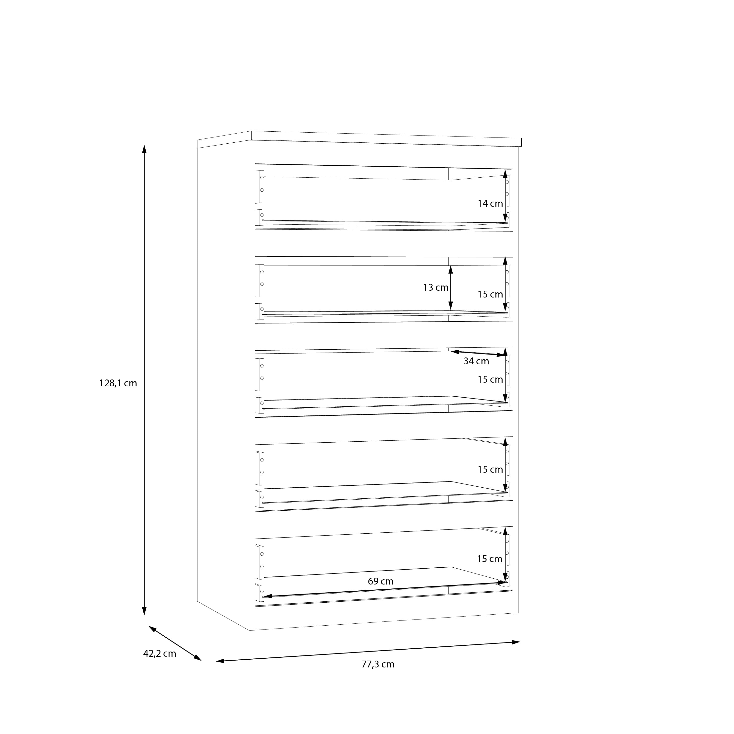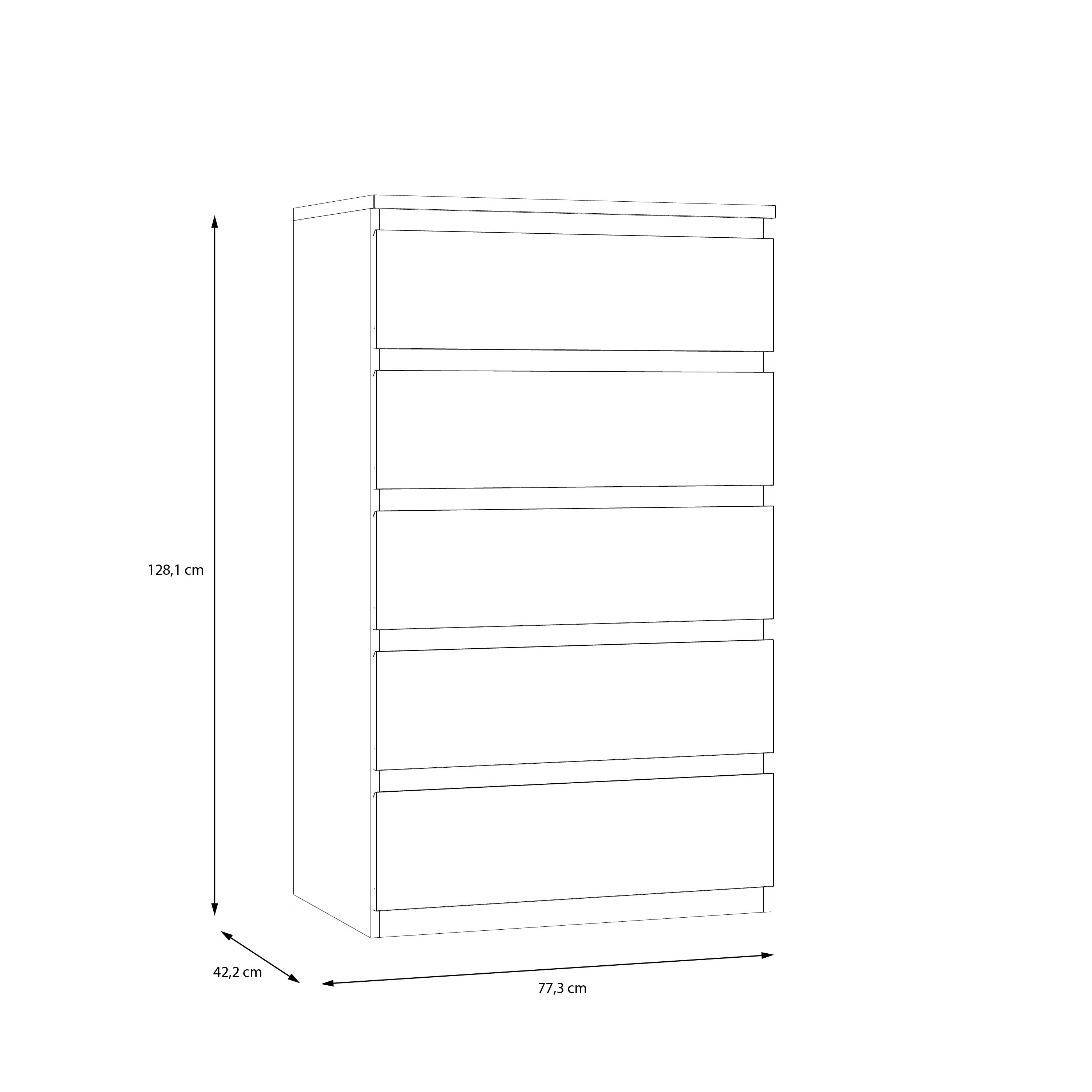 - Dimensions: Measuring Width 77cm, Height 128cm, and Depth 42cm, this wide chest of drawers offers significant storage without taking up excessive floor space in your bedroom.