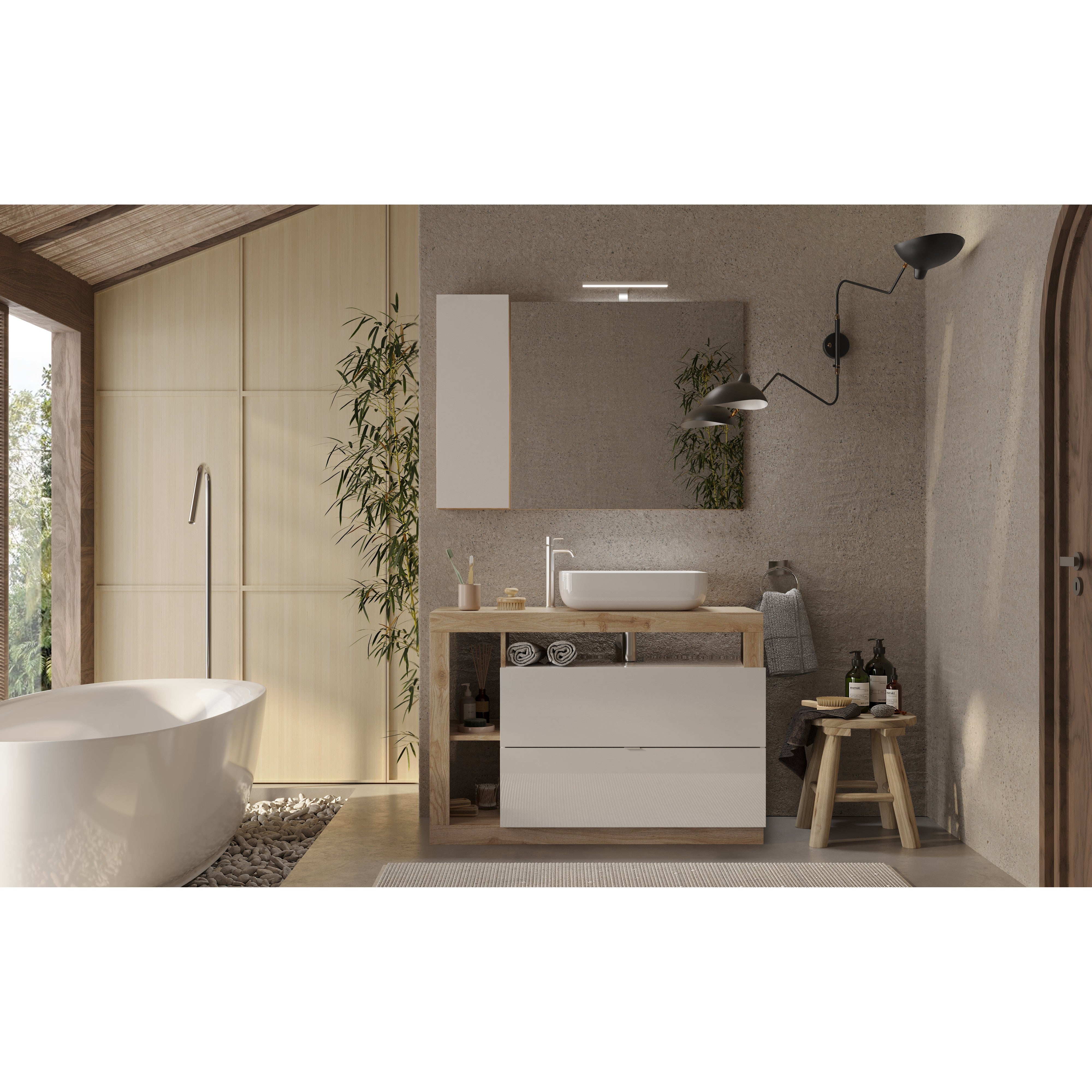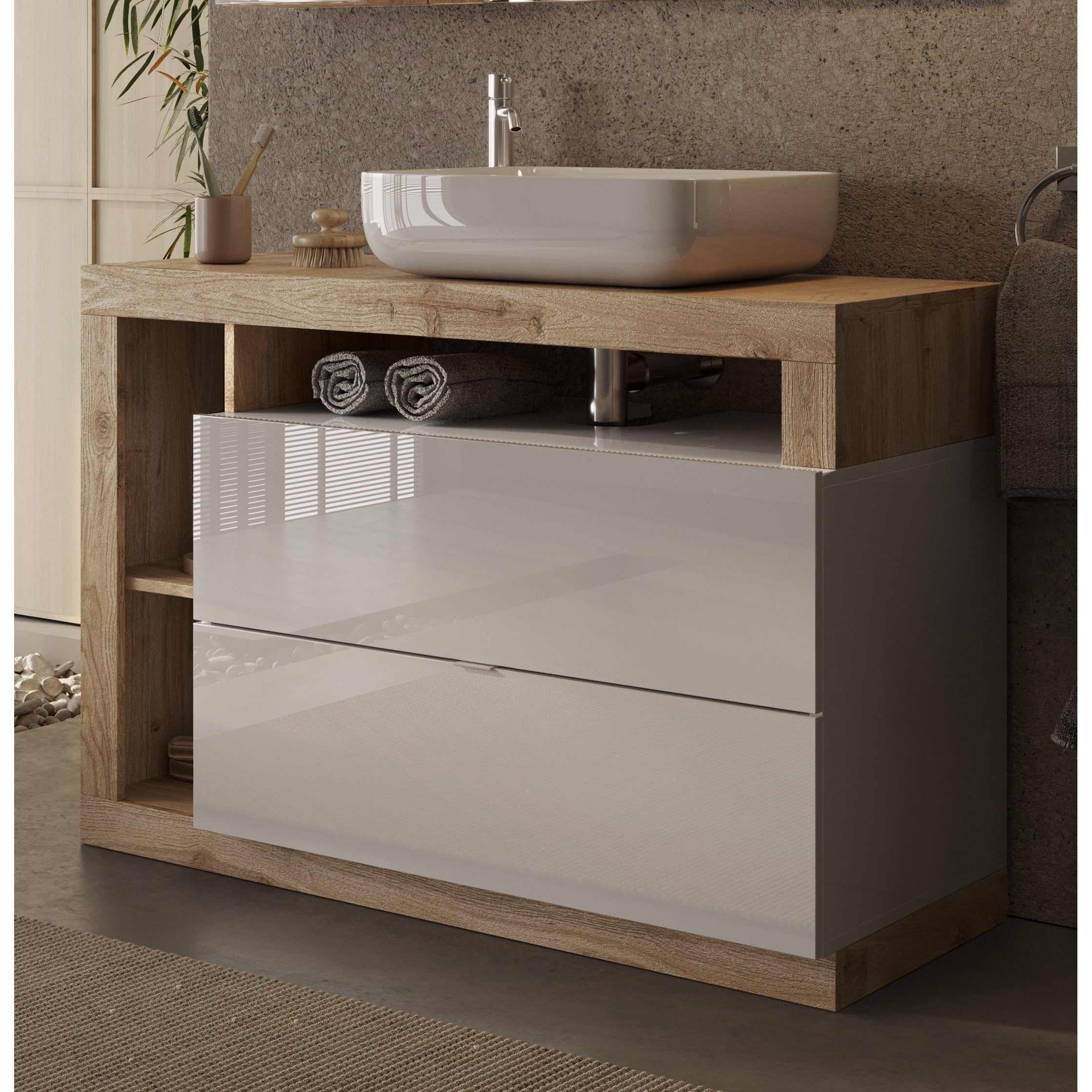 Shop the exclusive selection of Lorenzo Free Standing Vanity Unit Today in a range of different sizes to cater for your needs. No matter how big or small your bathroom we’ve got the perfect size countertop vanity units to create the most stylish bathroom ever! Offering you a contemporary design this free-standing 1100mm vanity unit is a practical storage solution, perfect for giving your bathroom a clean, clutter free look! Equipped with 2 drawers and multiple open compartment shelves. The body of this countertop unit is finished in a popular Cadiz Oak allowing you to breathe life into your bathroom. Combined with the Cadiz oak body is two white gloss drawers. A perfect colour contrasting combination which would suit almost any interior.