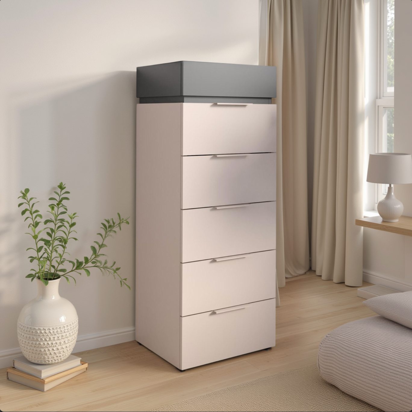 Maximise your bedroom storage with the sophisticated Luke 6 Drawer Tall Chest of Drawers. This contemporary tall chest is finished in a luxurious cashmere, complemented by a striking Anthracite top, offering a modern and elegant aesthetic perfect for any home. Designed with practicality and style in mind, it features six generously sized drawers, providing extensive storage for clothing, linens, and other bedroom essentials.