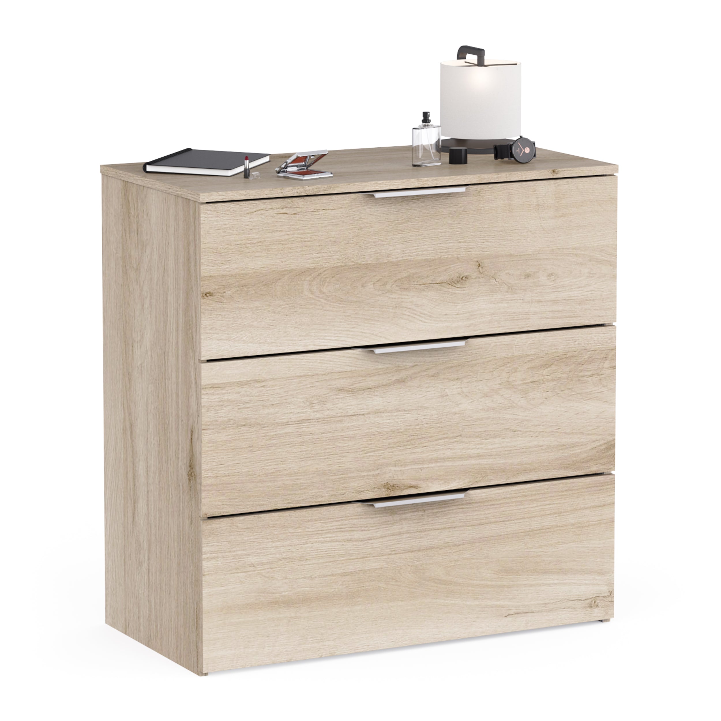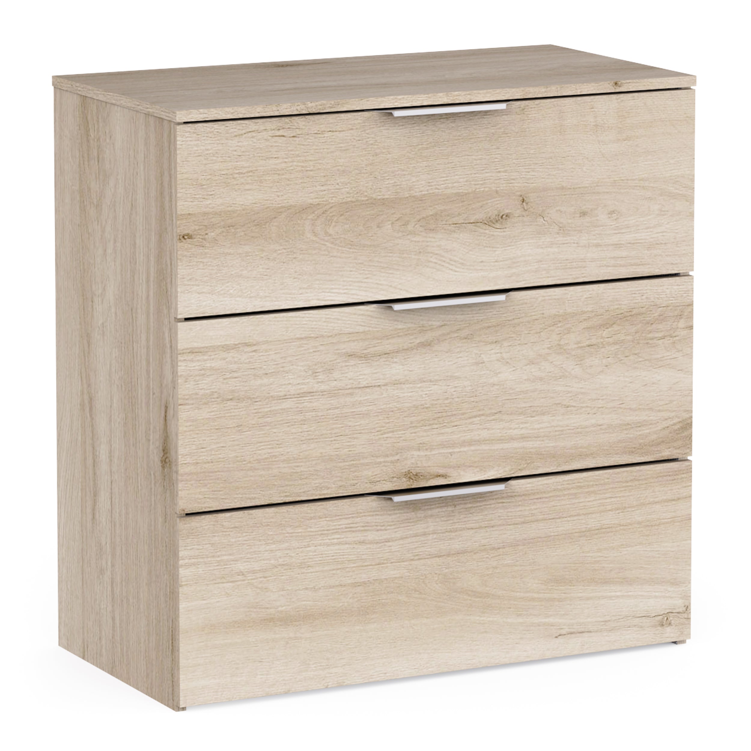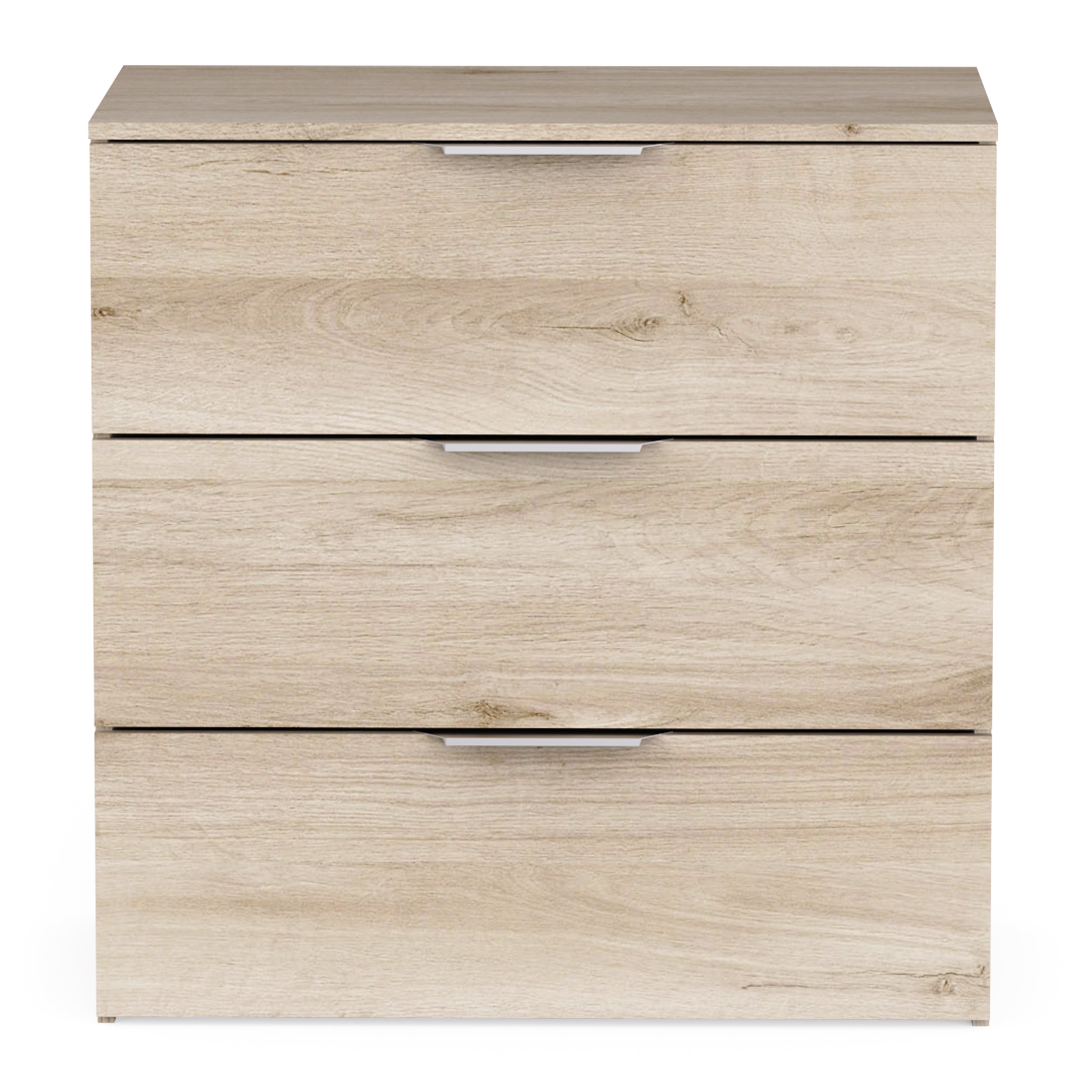 Add a touch of simplicity to your bedroom or living space with the Chicago 3 Drawer 80cm Chest of Drawers. This compact chest is finished in Kronberg Oak, offering a versatile and contemporary look. It features three generously sized drawers, providing ample concealed space for clothing, linens, or other essentials. The sleek design is complemented by subtle silver handles, adding a touch of understated elegance.
