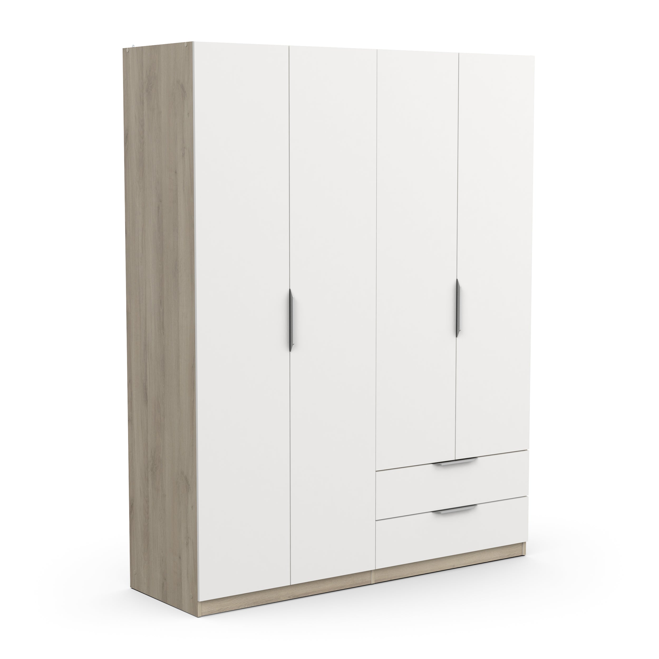 Maximise your bedroom today with our stylish collection of Chicago space saving wardrobes. Available in a contrasting matt white and kronberg oak effect colour combination this wardrobe will breathe life into in any home. With a 4 door configuration you can benefit from a large hanging space, 4 internal shelves (including 2 adjustable ones) and 2 drawers offering you lots of versatility. A brilliant all in one storage solution for all your clothing and accessory organisation. This hinged wardrobe is available in just under 160cm making it a brilliant for narrow, compact spaces such as small bedrooms and apartments.