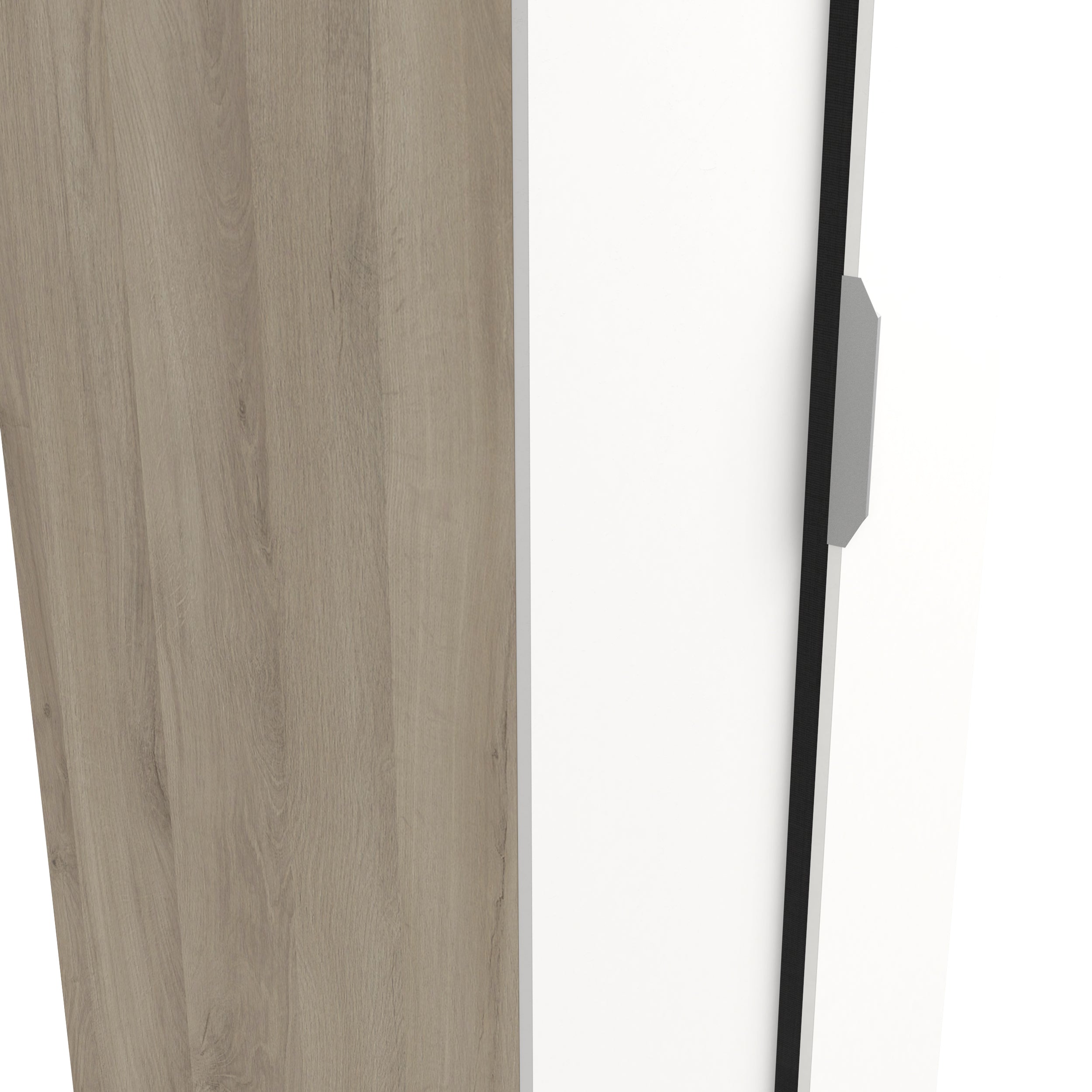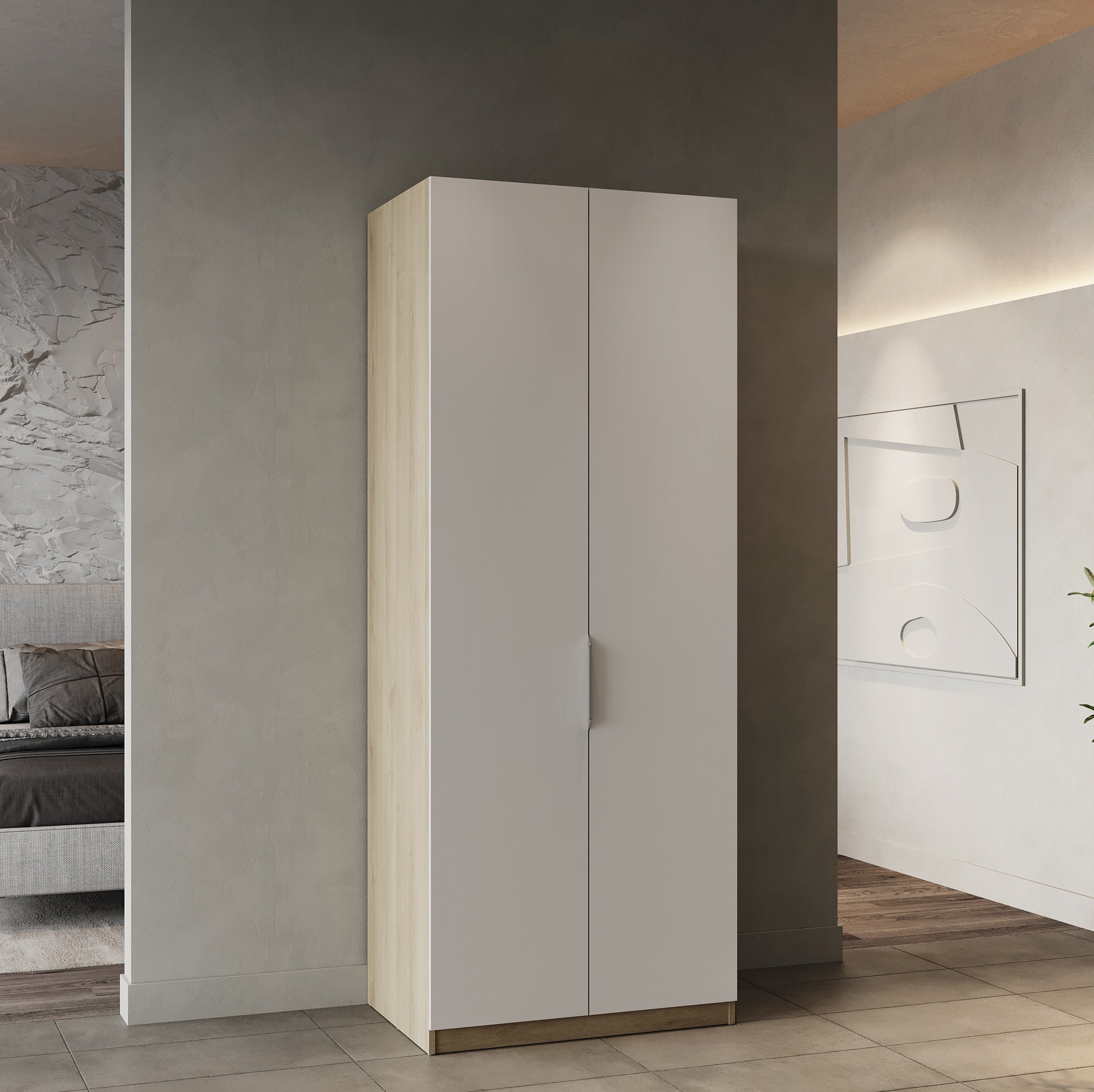 Enhance your bedroom today with the Chicago range of 2 Door Hinged Wardrobes in a selection of stylish colour finishes. This matt white and oak effect double wardrobe offers the perfect blend of style and practicality. A compact and narrow wardrobe is the ultimate space saving storage solution for small bedrooms and apartments. Behind 2 hinged doors, this 80cm wardrobe offers a hanging rail to organise all your clothes and a top hat shelf ideal for all your clothing which needs to be folded away. This hinged wardrobe is finished with matt white door fronts and a Kornberg oak effect body with a silver lacquered door handle allowing it to breathe fresh air in any existing interior.