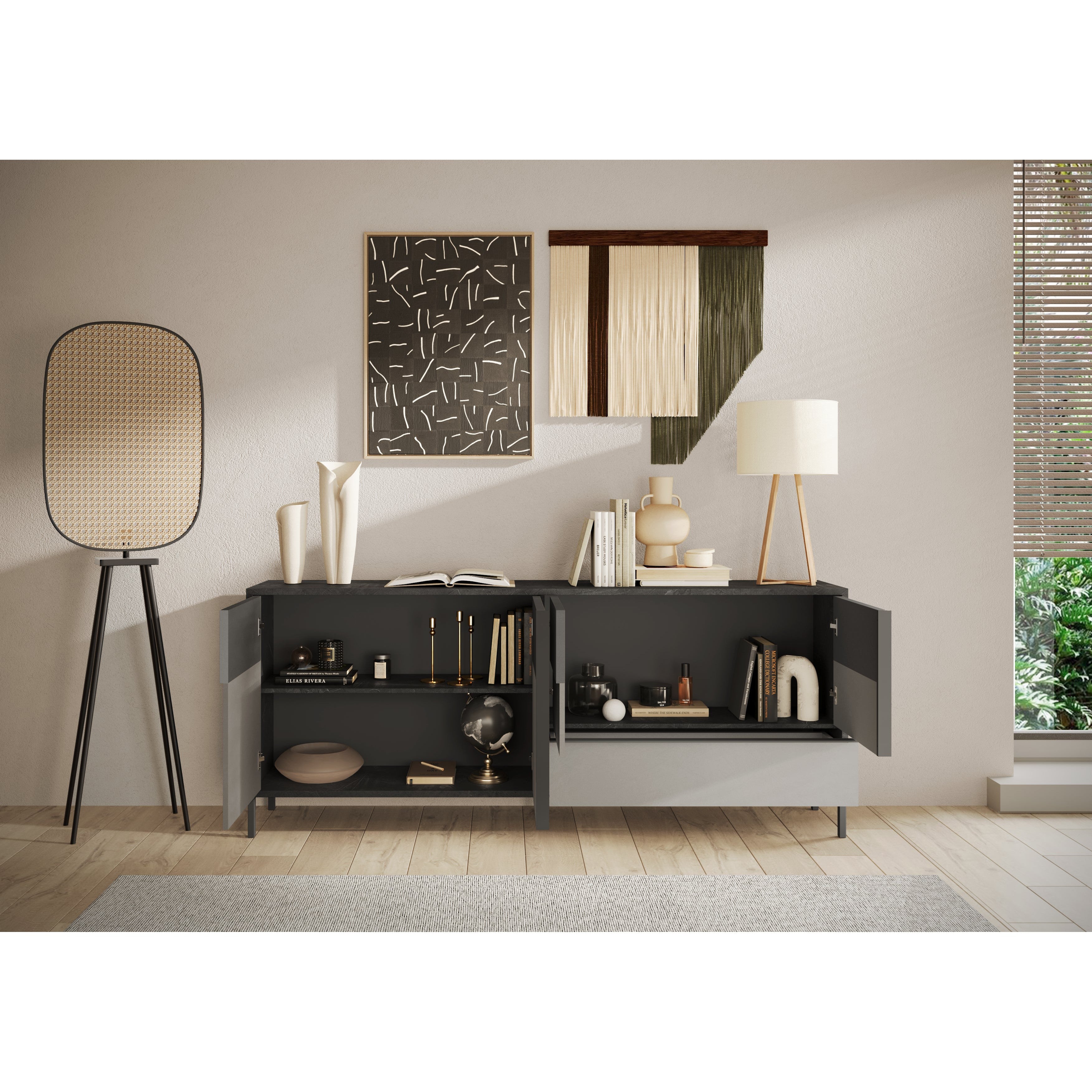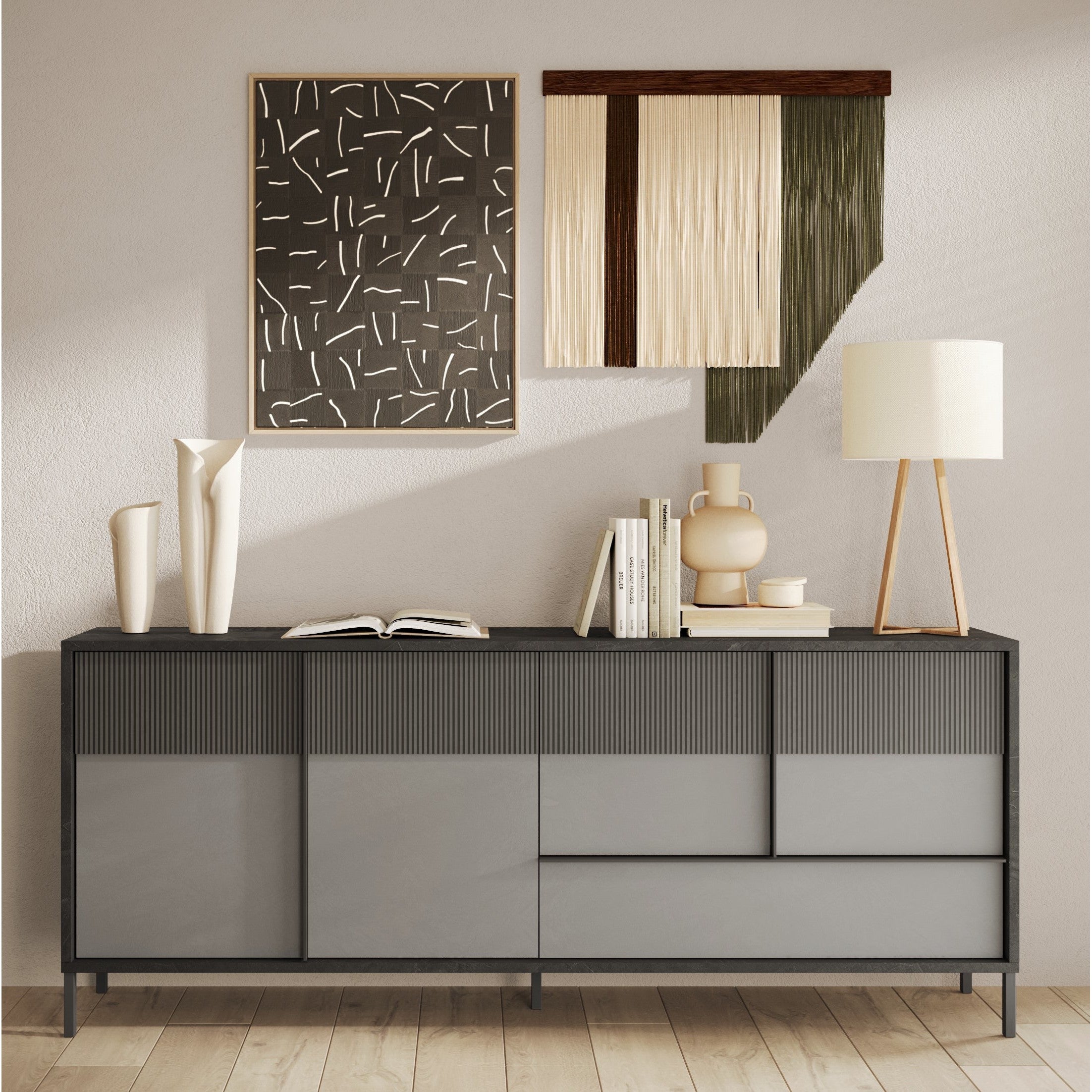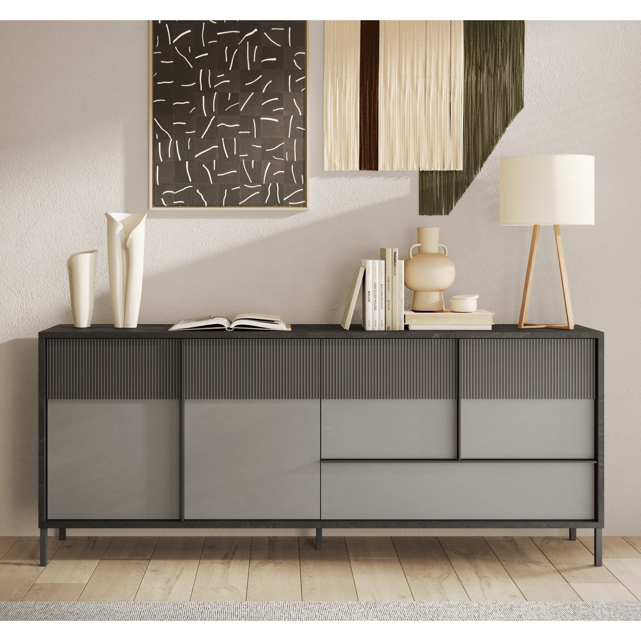 Highlighting extrinsic and intrinsic beauty is the Venice 4 Door 1 Drawer Lead and Slate Grey Sideboard with Black Legs, a versatile addition to any living or dining space. A tribute to organic elegance and simplicity, Italian design boasts features of a printed 3D wood panelling effect paired beautifully with lead, slate and chalk to harmonise modern aesthetics. Exhibiting ample storage space, this Large sideboard boasts 4 doors and 1 drawer with slick metal handles, all at your disposal to store your home essentials. It really is the sideboard of dreams!